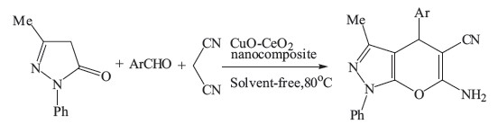 4H-Benzo[b]pyran derivatives are an important class of heterocyclic compounds having important pharmaceutical and biological activities. These compounds are used as anticancer, anticoagulant,diuretic,spasmolytic and antianaphylactic agents [1]. Therefore 4H-benzo[b]pyrans received significant amount of attention from pharmaceutical and organic chemistry communities. The commonly used method for the synthesis of 4Hbenzo[b]pyrans is the condensation of aldehyde,cinnamonitrile derivatives and dimedone in the presence of acidic or basic catalysts. Therefore,various methods have been developed for the synthesis of 4H-benzo[b]pyrans [2, 3, 4, 5, 6, 7, 8, 9, 10]. Also,these compounds can be prepared via multicomponent condensation reactions of aldehydes,cinnamonitrile derivatives and 3-methyl-1-phenyl-2- pyrazoline-5-one [11, 12, 13, 14, 15]. Recently,development of nano catalysts has emerged as a fertile field for research and innovation. In particular,nanocrystalline oxides have proven useful to chemists in the laboratory and industry due to the efficient activation of the adsorbed compounds and reaction rate enhancement,selectivity, easier work-up and recyclability of the supported catalysts and the eco-friendly green reaction conditions [16, 17, 18]. Also the practical applications of nanocomposite metal oxides as the catalysts in organic synthesis have increased due to their high catalytic activity because of the large surface area [19, 20, 21]. Recently,the catalytic application of CuO-CeO2 nanocomposite for the oxidation of CO in H2-rich streams was reported [22][22]. Although there is a report on the synthesis and catalytic properties of CuO-CeO2 catalyst,the applicability of CuO-CeO2 nanocomposite in organic reactions and synthesis of biologically important molecules is yet to be investigated. Therefore,we decided to prepare and use this catalyst in the organic synthesis. In continuation of our research program to develop efficient and green catalysts in organic synthesis [23, 24, 25, 26],herein we wish to report the applicability of CuO-CeO2 nanocomposite as a heterogeneous,green and recyclable catalyst for the synthesis of biologically important 4H-benzo[b]pyran derivatives via the one-pot three-component condensation of 3-methyl-1-phenyl-2- pyrazoline-5-one with aromatic aldehydes and malononitrile under solvent-free conditions (Scheme 1).