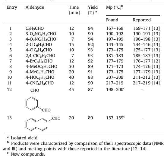 All products were characterized by comparison of their spectroscopic data (1H NMR,IR) and physical properties with those reported in the literature. Chemicals were purchased from Fluka and Merck chemical companies. Yields refer to isolated pure products.