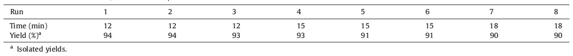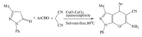 The solid products were easily isolated by simple filtration and recrystallized from hot ethanol. All known products were identified by comparison of the melting points and the analytical data (IR,NMR) with those reported for authentic samples. Also,it should be mentioned that products were obtained without byproducts in good to high yields with short reaction times. In organic reactions,when a heterogeneous catalyst is used,the recyclability of the catalyst is very important. In order to investigate the recyclability of the CuO-CeO2 nanocomposite, the reaction of benzaldehyde,malononitrile and 3-methyl-1- phenyl-2-pyrazoline-5-one,was selected again as a model. In this experiment,after the completion of the reaction,the catalyst was washed with hot acetone,dried and stored for another consecutive reaction run. The recycled catalyst has been examined in the next run and the desired products were obtained in good to high yields. This process was repeated for 8 times and no appreciable decrease in yield was observed (Table 2).