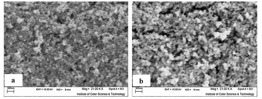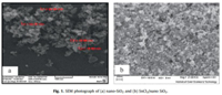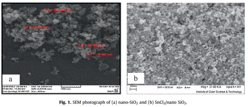 | Fig. 1. SEM photograph of (a) nano-SiO2 and (b) SnCl2/nano SiO2. | |