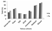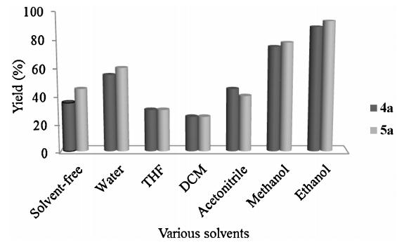 In the next step,the synthesis of 4a and 5a was separately carried out in different solvents such as water,ethanol,methanol, tetrahydrofuran (THF),acetonitrile and dichloromethane (DCM) under stirring and reflux. The results are summarized in Fig. 4. In the presence of water the products were obtained in low yield 55%-60%.