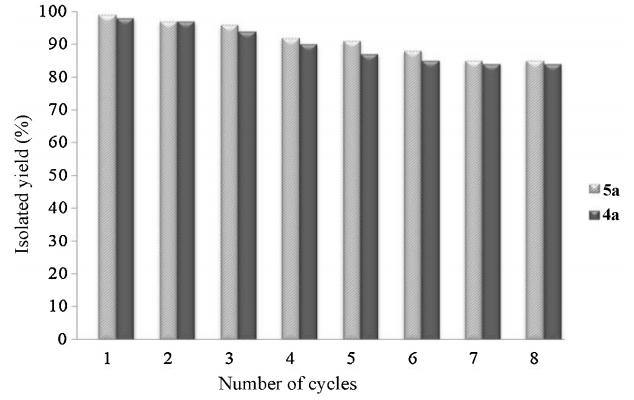 | Fig. 5. Repeated use of SnCl2/nano SiO2 for the synthesis of 4H-pyran derivetives 4a and 5a. | |