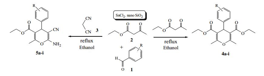 However,many of these methods require expensive reagents, acidic conditions,long reaction times,excess of reagents/catalyst,or toxic organic solvents and tedious workup,yet the yields are sometimes not ideal. In recent years,the use of heterogeneous catalysts has provided significant advantages in organic synthesis,for example,environmental compatibility,operational simplicity; also they are low cost,nontoxic,and easy to separate from the reaction mixtures [22, 23]. Furthermore,heterogeneous solid acids and especially those based on silica gel and other mesoporous high surface area support materials are beginning to show an influential role in the greening of fine and speciality chemicals manufacturing procedures [24, 25, 26]. In continuation of our recent work using heterogeneous solid acid nanoparticles in organic reactions [27, 28, 29], we decided to investigate nano silica supported tin (II) chloride (SnCl2/nano SiO2) as a green catalyst for the practical and environmentally benign one-pot multicomponent synthesis of diethyl 2,6-dimethyl-4-aryl-4H-pyran-3,5-dicarboxylates and 6-amino-5-cyano-2-methyl-4-aryl-4H-pyran-3-carboxylic acid ethylester (Scheme 1).