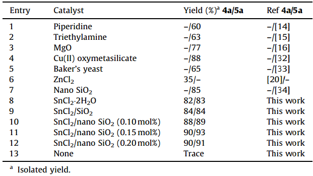 Initially,a series of comparative experiments were performed to compare the effectiveness of SnCl2/nano SiO2 versus other catalysts in the formation of polyfunctionalized 4H-pyran. In some cases,data for other catalysts were taken from the literature. The results are shown in Table 1. SnCl2/nano SiO2 was assessed to be the most efficient of all tested catalysts,in terms of reaction time and yield (Table 1,entry 11). As shown in Table 1,the yield for products 4a and 5a is high in the presence of SnCl2/SiO2 as a catalyst (Table 1,entry 9). Also it indicates the yields of products in the presence of SnCl2/nano SiO2(Table 1,entry 10) are higher than those catalyzed by SnCl2/SiO2. We believe that the heterogeneous nanoparticles have higher surface-to-volume ratio,which provides a larger number of active sites per unit area in comparison to their heterogeneous counterparts. Also,as shown in Table 1 no product was obtained in the absence of the catalyst (Table 1,entry 13).