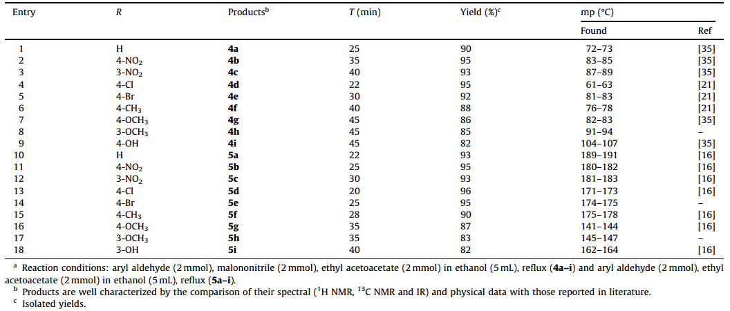 2.2. General procedure for the preparation of diethyl 4-aryl-2,6-dimethl-4H-pyran-3,5-dicarboxylate (4a-i)A mixture of aldehyde (2 mmol),ethyl acetoacetate (4 mmol), and nano silica supported tin (II) chloride (0.15 mol%) was refluxed in ethanol (10 mL) for the appropriate time (monitored by TLC analysis). The hot reaction mixture was filtered to separate the catalyst and filtrate was solidified after cooling to room temperature. Then,ice water was added to mixture. The organic phase was extracted with dichloromethane,washed with water and dried with Na2SO4. The solvent was removed under reduced pressure. The crude products were purified by recrystallization (ethanol and water) with sufficient purity for spectral analysis.
