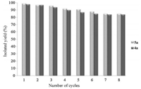 As an environmentally-friendly methodology,the reuse and recovery of the SnCl2/nano SiO2 are highly desirable. In order to study the reusability of nano silicagel supported tin (II) chloride as a catalyst,eight batches of the experiments were carried out for the preparation of products 4a and 5a (Fig. 5). The catalyst was filtered off and washed with an excess of ethanol and reused in a new reaction.
