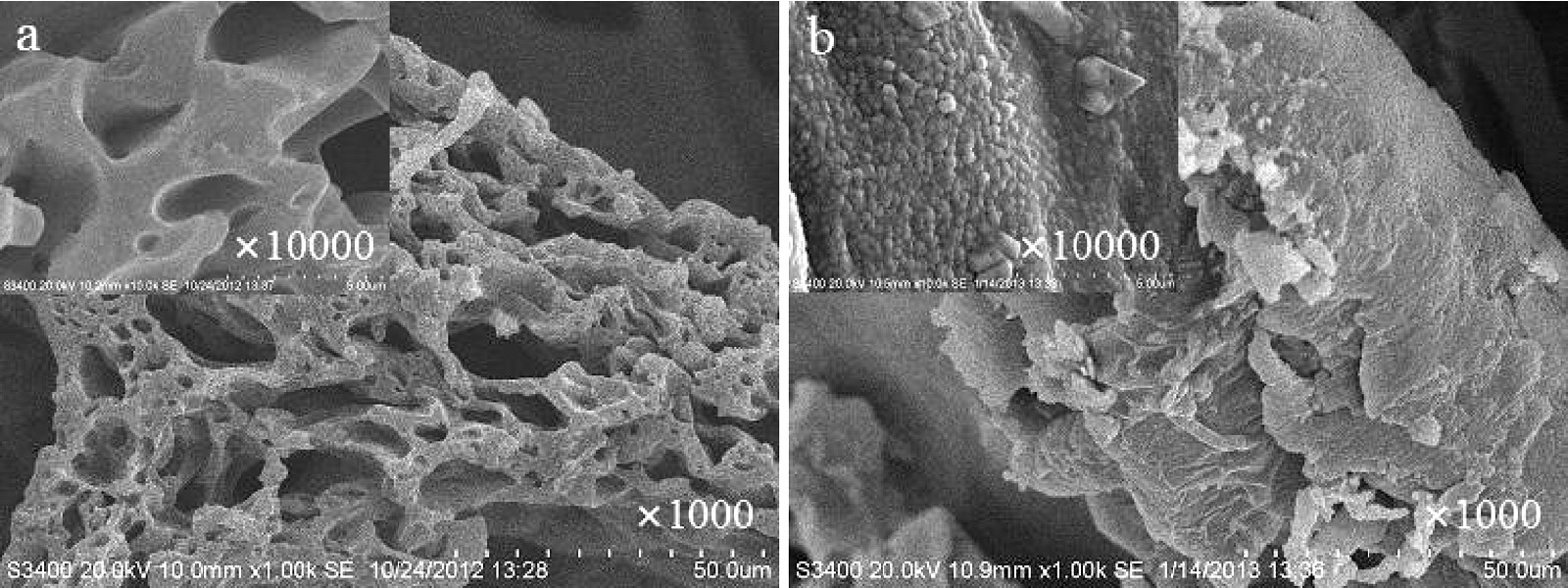 | Fig. 1. SEM photos of sponge (a) PVA and (b) PVA-MA-HH. | |
