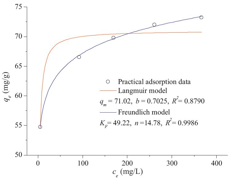 Cu2+ was about 73.23 mg/g. The Freundlich model could fit the
