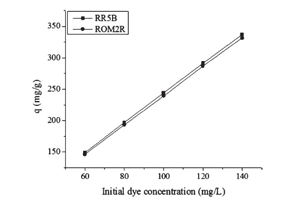 The adsorption capacity of the SAH DDA6 was also determined with different initial dye concentrations of RR5B and ROM2R dyes. The concentration of anionic dyes was varying from 60 mg/L to 140 mg/L. It was found that an increase in RR5B and ROM2R dye concentration led to an increase in adsorption capacity as shown in Fig. 3. This increase in adsorption capacity in relation to the RR5B and ROM2R dye concentration could be explained with the high driving force of mass transfer.