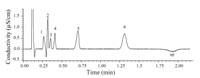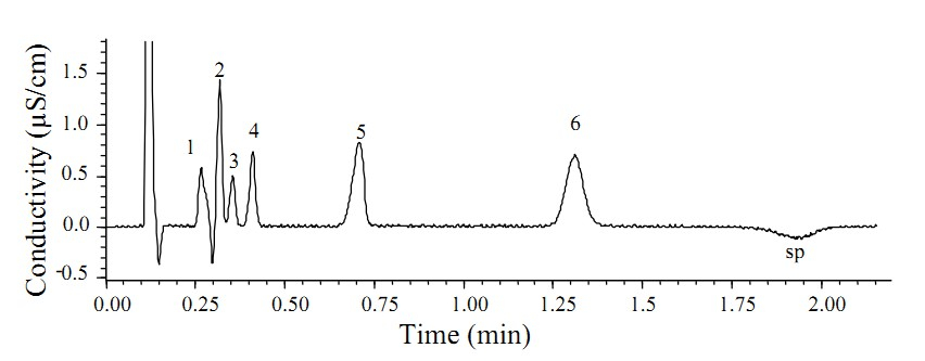 | Figure. 1. Ion-pair chromatogram of a standard mixture of thiocyanate and other five common anions. Chromatographic conditions: Chromolith Speed ROD RP-18e column (50 mm × 4.6 mm i.d.); eluent of 0.25 mmol/L TBA-0.18 mmol/L phthalic acid-7% acetonitrile (pH 5.5); flow rate of 6.0 mL/min; column temperature of 30 ℃; 20 μL inject volume; direct conductivity detection. Peaks: (1) Cl -1 (4.0 mg/L); (2) NO3-1 (8.0 mg/L); (3) ClO3-1 (4.0 mg/L); (4) I-1 (8.0 mg/L); (5) SCN-1 (12.0 mg/L); (6) SO4-2 (8.0 mg/L); sp: system peak. | |