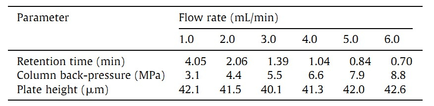 | Table 1 Effect of flow rate on retention time of thiocyanate,column back-pressure and column efficiency. |