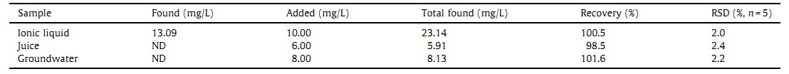 | Table 2 Analytical results and recoveries of thiocyanate founded in ionic liquid,groundwater and juice. |