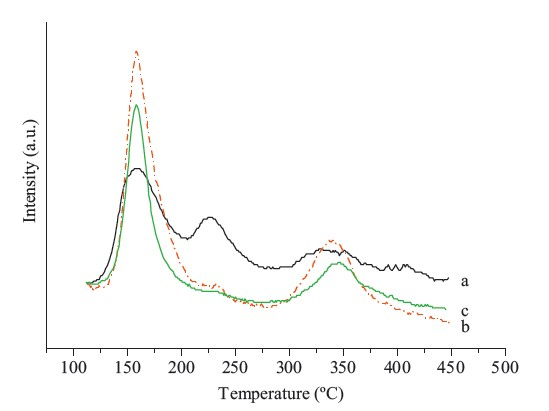 Fig 2 NH3-TPD profiles of Cu/SiO2-Al2O3 (a),Cu/NaY (b) and Cu/NaY-K2O (c). |