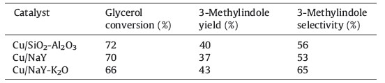 3. Results and discussionTable 1 shows the activity and selectivity of Cu/SiO2-Al2O3,Cu/ NaY or Cu/NaY-K2O. Compared with Cu/SiO2-Al2O3,Cu/NaY showed lower activity and selectivity. After adding K2O to Cu/ NaY,although the conversion of glycerol decreased,the selectivity of 3-methylindole increased remarkably,which resulted in the increase of 3-methylindole yield to 43%.