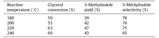 Today,more and more attention focuses on the production of value-added chemicals from renewable resources such as biomass [13, 14, 15]. Glycerol,which comes from biomass,is not only cheap and abundant,but also known as a green renewable feedstock. Therefore,the vapor-phase synthesis of 3-methylindole from glycerol and aniline is a promising route.