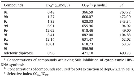 The synthesized compounds were evaluated for their inhibitory effect on the replication of HBV in HepG2 2.2.15 cells according to Ref. [14]. The HepG2 2.2.15 cells were plated at a density of 5 × 104 cells/well on 24-well plates and incubated for 2 days. The medium was replaced with medium containing test compounds in gradient concentration (10, 1, 0.1 mg/mL). After 2 days of treatment, the culture medium was removed, and then fresh medium containing the same concentration of the test compounds was added to the cultures again. At day 10, the supernatants were collected and lyzed for the intracellular HBV DNA analysis. The amount of HBV DNA in each condition was measured by real time PCR using Icycler (Bio-Rad). Amplification primers were HBVFP: 5'- TGT CCT GGTTAT CGC TGG-3' and HBVRP: 5'-CAA ACG GGC AAC ATA CCT T-3' . The TaqMan probe was FAM-5'-TGT GTC TGC GGC GTT TTA TCAT-3'-TAMRA. The half maximum cytotoxic concentration values (CC50) for each compound were measured by calculating the cell growth rates by a standard procedure. The cells were plated at a density of 5 × 104 cells/well on 24-well plates and incubated for 12 h. Then supernatant was replaced with DEME medium containing test compounds at final concentrations of 1000, 100, and 10 μmol/L and the cells were cultured for 2 more days. At the end of the incubation period, 10 μL of Cell Counting Kit-8 (CCK-8) was added to each well and the cells were cultured for another 2 h. The OD value was measured at 450 nm. The data were analyzed by using Icycler IQ 3.0. IC50, CC50 and SI of these compounds are reported in Table 1. Adefovir dipivoxil was used as positive control.