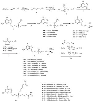 As shown in Scheme 1, paraformaldehyde was converted to 2- chloroethyl chloromethyl ether (1) by treatment with 2-chloroethanol and hydrochloric acid gas at low temperature (0 ℃-r.t.), the obtained compound then coupled with triethyl phosphite at 110 ℃ to afford 2-chloroethoxymethyl phosphonic acid diethyl ester (2). Then, condensation of the obtained 2 with 2-amino-6- chloropurine gave 2-amino-6-chloro-9-[2-(phosphonomethoxy) ethyl] purine bisethyl ester (3). The compound then coupled with substituted arylthiol, cyclopropylamine, benzylamine or morpholine in the presence of Et3N and DMF at 80-100 ℃ to afford compounds with different substitution at the 6-position of the purine ring (4a-d). These were then treated with trimethyl bromide silane at 80 ℃ to afford 2-amino-6-(arylthiol, cyclopropylamino, benzylamino or morpholinyl)-9-[2-(phosphonomethoxy) ethyl] purine (5a-d). The obtained compounds then coupled with N-Boc L-amino acid 2-bromoethyl esters (6a-c) to form 2-amino-6-substitution-9-[2-(phosphonomethoxy) ethyl] purine mono N-Boc L-amino acid ethyl ester (7a-i), which then coupled with 3-bromo-1-propyl esters of non-steroidal antiinflammatory drugs (8a,8b), in the presence of N,N'-dicyclo- $()1DFGIST[]cehm hexyL-4-morpholine carboxamidine (DCMC) as an acid scavenger in anhydrous DMF by using a "one pot synthesis" method. Finally, we removed the protecting group N-Boc by using 85% H3PO4 to obtain the target compounds (9a-i). Total yields for target compounds were in the range of 6.9%-15.2%.