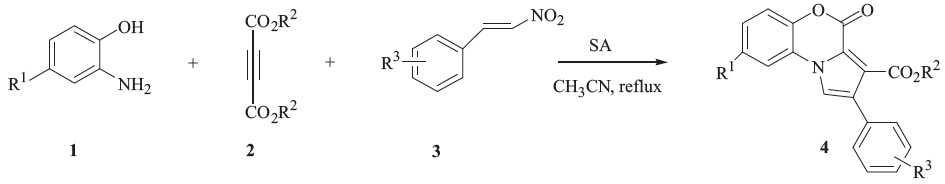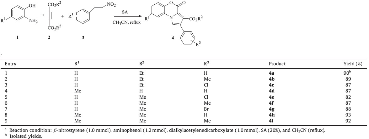 First, we studied the reaction of 2-amino phenol, diethyl acetylenedicarboxylate and β-nitrostyrene in order to optimize the reaction conditions with respect to temperature, time, and the molar ratio of SA to the substrates. We found that 20 mol% of SA was sufficient to obtain the corresponding pyrrolo-1,4-benzoxazine 4a in 90% yield within 24 h in CH3CN under reflux conditions. The reaction was run without SA as catalyst and we did not obtain any product. We also examined other solvents such as methanol, 1,2-dichloroethane, tetrahydrofuran and toluene. When methanol, toluene, tetrahydrofuran or 1,2-dichloroethane was employed as solvents under reflux conditions, approximately the same results as in acetonitrile were obtained. With the optimized conditions in hand, the three-component reaction of 2-aminophenols, dialkylacetylenedicarboxylates and β-nitrostyrene derivatives for the synthesis of pyrrolo-1,4-benzoxazines were studied. The results are summarized in Table 1. The yields were not sensitive to the substrates employed. Nearly all reactions give similar isolated yields, and the reaction is clean with no side products observed. The 1H NMR and 13C NMR spectra of the crude products clearly indicated the formation of pyrrolo-1,4-benzoxazine 4a-i. Products other than 4 could not be detected by NMR spectroscopy.