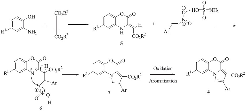 During the last two decades, multicomponent reactions have been exploited by combinatorial chemists as a source of appendage diversity. One-pot multicomponent reactions are often resourceeffective and environmentally acceptable and, thus, greener as compared to multistep reactions. They can offer significant advantages over conventional single-step syntheses by reducing reaction time and saving money, energy, and raw materials, thus resulting in both economical and environmental benefits. At the same time, diversity can be achieved by building up libraries by varying each component [1]. 1,4-Benzoxazine ring systems are found in a broad range of natural and synthetic biologically active molecules [2, 3, 4, 5, 6, 7, 8, 9]. Recently, pharmacological evaluation and structure- activity relationships of some of simple or fused pyrrolo-1,4- benzoxazines have been reported [7, 8, 9]. Although pyrrolo-1,4- benzoxazines play important roles in drug discovery as biologically active compounds, the available strategies for the synthesis of these compounds are limited. So far, only a few methods have been described for the assembly of these tricyclic compounds, which have two common disadvantages: (i) The substituents to diversify products are limited. For example, it is difficult to incorporate diverse substituents on a pyrrole ring. (ii) The products were obtained in low yields because of the multistep reactions required or multiple byproducts incurred [6, 7, 8, 9]. Sulfamic acid (H2N3O3H, SA), a common inorganic acid, is nonvolatile, noncorrosive, stable, water resistance and incapable of forming metal complexes, making it an outstanding alternative to metal catalysts in different areas of organic synthesis as an efficient and green reagent [10]. As part of our current studies [11, 12, 13, 14] on the development of new routes to heterocyclic system, we report here a one-pot catalytic reaction involving 2-aminophenols 1, dialkylacetylenedicarboxylates 2, and nitrostyrene derivatives 3 in the presence of SA, which leads to pyrrolo-1,4-benzoxazine derivatives in high yields (Scheme 1).