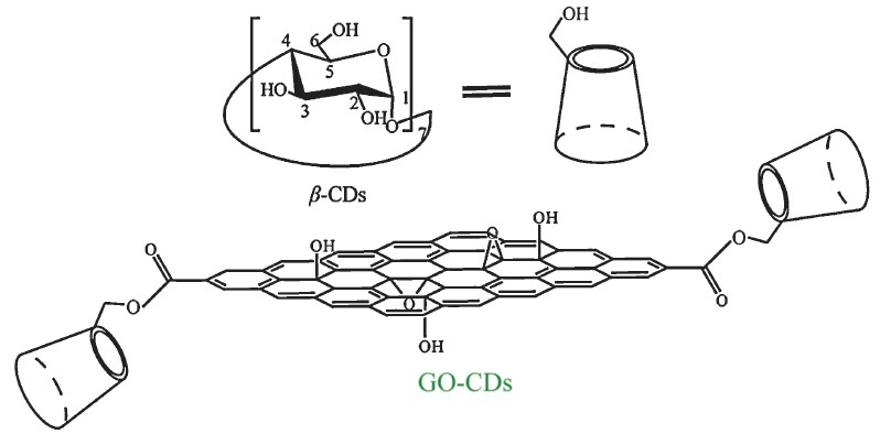 β-CDs are macrocyclic compounds composed of seven Dglucose units linked together by a-(1,4)-glycosidic bonds. In CDs, each glucopyranose unit contains three free hydroxyl groups, which differ both in their function and reactivity. The reactivity of the primary hydroxyl groups at 6-positions is the highest. However,unmodified or unsubstituted β-CDs have poor water solubility (1.85 g/100 mL at 20℃) and,cyclodextrins,containing peculiar hydrophobic cavum,could form inclusion complexes with various guest molecules. Several CDs functionalized graphene systems have been developed utilizing both noncovalent and covalent approaches recently [11, 13, 16, 17].