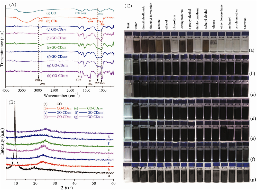 | Fig. 2.(A) FT-IR spectra of GO,CDs,and GO-CDs hybrid materials. (B) XRD spectra of GO,CDs,and GO-CDs hybrid materials. (C) Photographs of GO and GO-CDs hybrid materials dispersed in water and 14 organic solvents through bath ultrasonication. (a) GO; (b) GO-CDs70; (c) GO-CDs80; (d) GO-CDs90; (e) GO-CDs100; (f) GO-CDs110; (g) GO-CDs120. | |