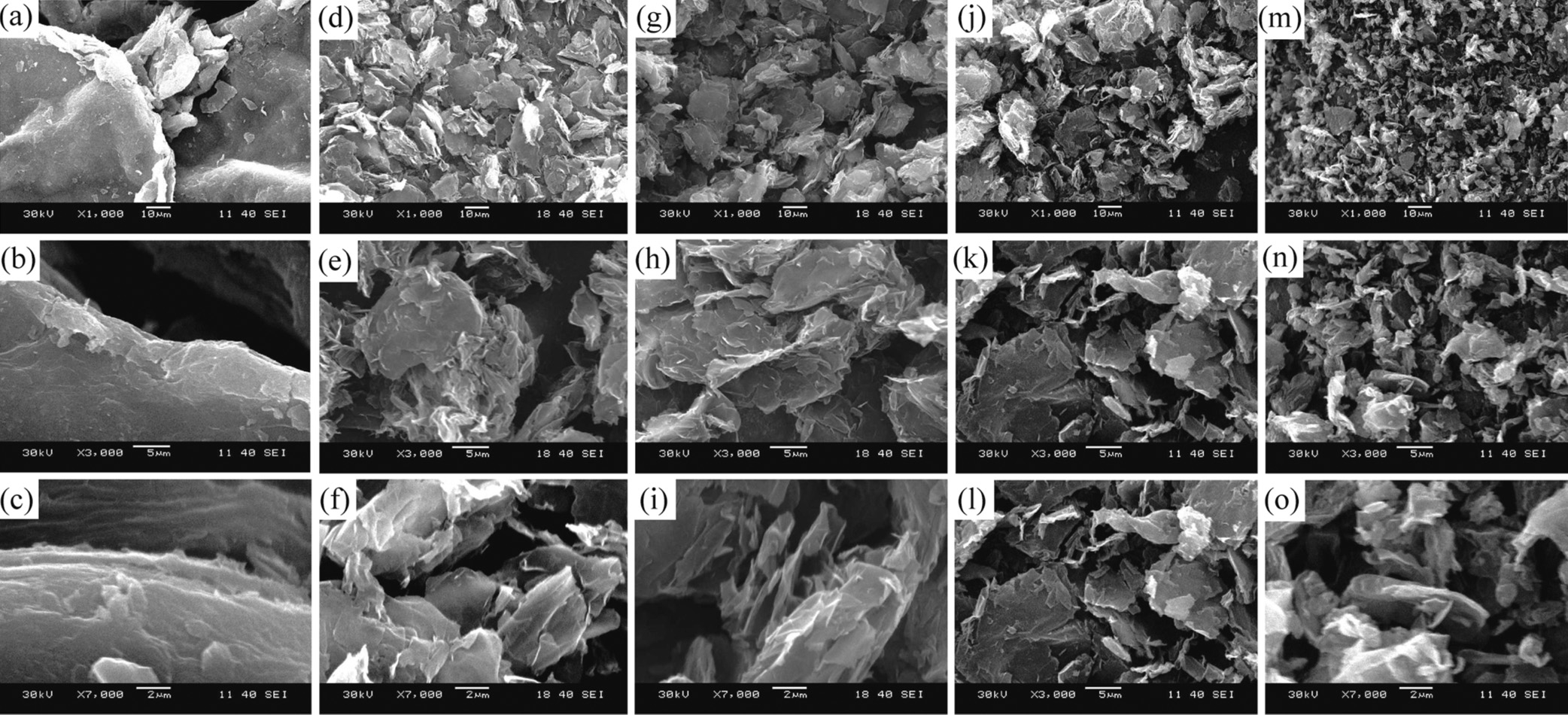 | Fig. 3.Low and high magnification SEM images of GO (a- c),GO-CDs70 (d-f),GO-CDs90(g-i),GO-CDs100 (j-l),and GO-CDs120 (m-o) as typical examples. | |