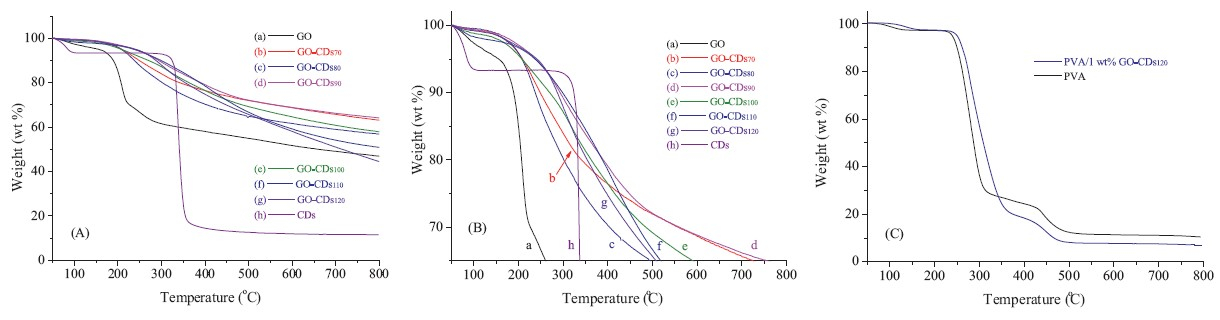 | Fig. 4.(A and B) TGA curves of GO,CDs,and GO-CDs hybrid materials. (C) TGA curves of PVA,PVA/1 wt.% GO-CDs100,and PVA/1 wt.% GO-CDs120 composite materials. | |