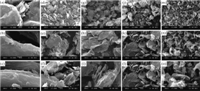 In Fig. 3,low and high magnification SEM images of GO (a-c), GO-CDs70 (d-f),GO-CDs90 (g-i),GO-CDs100 (j-l) and GO-CDs120 (m-o) as typical examples are compared. The morphologies reveal that the large two-dimensional GO with layered-structures exhibits face-to-face stacking of sheets. The close interlayer spacing is mainly due to the strong Van der Waals forces between the layers [23]. After functionalization,the stacking of every layer of GO-CDs is as a whole much more desultory,which would be conductive to their dispersion in solvents. This phenomenon is consistent with the results of XRD demonstrated above.