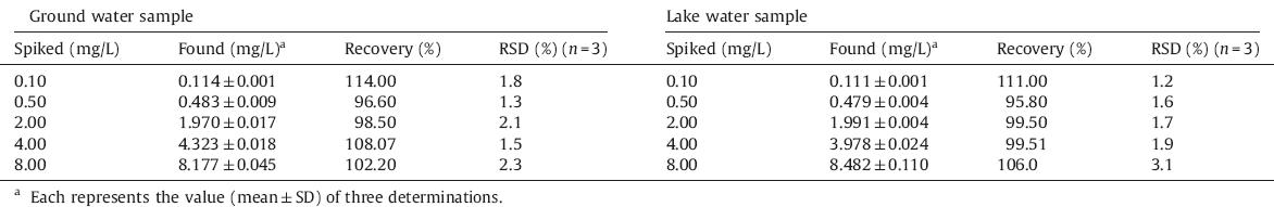 | Table 1 Recovery and RSD (%) for spiked water samples. |