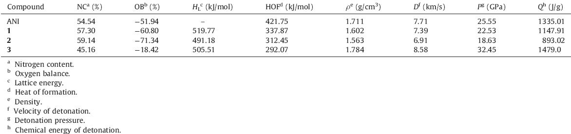 Preparation of guanidinium ANI (2): A solution of ANI (0.16 g, 1 mmol) in MeOH (10 mL) was slowly added to a mixture of the guanidine carbonate (0.09 g,1 mmol) in MeOH (5 mL) at 25°C with stirring. After stirring for 4 h at 65°C,the solvent was removed in vacuo and light yellow plate crystals were obtained after recrystallization from water (0.18 g). Yield: 81.8%; mp 135– 137°C; IR (KBr,cm-1): 3484,3338,2974,2134,1645,1493,1460, 1401,1367,1314,1204,1145,854,778,755,714,630,599; 1H NMR (500 MHz,D2O): &delat; 7.83 (s,1H); 13C NMR (125 MHz,D2O): &delat; 133.50,144.34,149.93,157.01; anal. calcd. for C4H7N9O2: C,22.54; H,3.31; N,59.14; found: C,22.56; H,3.35; N,59.11. Preparation of nitrate ANI (3): A solution of ANI (0.16 g, 1 mmol) in MeOH (10 mL) was slowly added to a solution of the nitric acid (0.07 mL,1 mmol) in MeOH (5 mL) at 25°C with stirring. After stirring for 4 h,the solvent was removed in vacuo and light yellow plate crystals were obtained after recrystallization from water (0.15 g). Yield: 75.5%; mp 122–124°C; IR (KBr,cm-1): 3147, 2136,1564,1523,1497,1440,1394,1353,1232,1204,1106,1001, 789,752,701,572,542; 1H NMR (500 MHz,D2O,): &delat;7.88 (s,1H); 13C NMR (125 MHz,D2O): &delat; 117.83,141.04,143.59; anal. calcd. for C3H3N7O5: C,16.60; H,1.39; N,45.16; found: C,16.63; H,1.42; N,45.11. 3. Results and discussion 3.1. Theoretical study