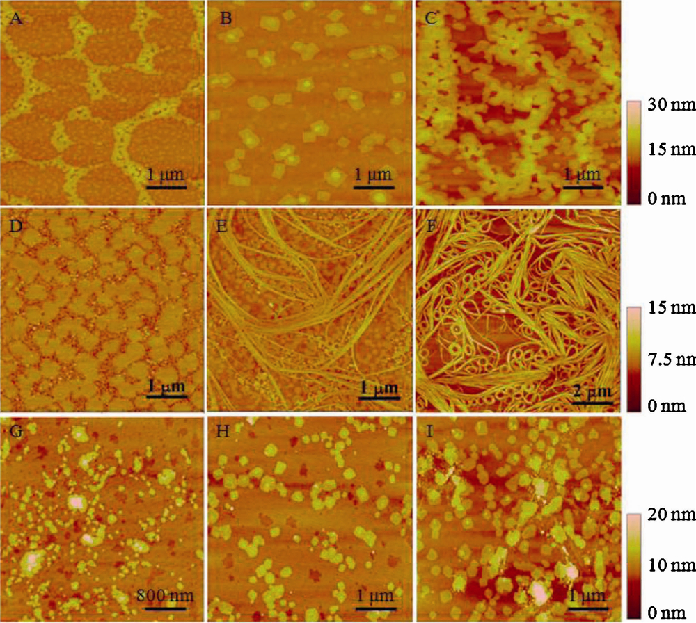 | Fig. 2.AFM images of one-layer LB films of the dendron compounds transferred from 1 mmol/L γ-CyD aqueous solution subphase of (A-C) 9-AGE at 0,5,15 mN/m; (D-F) 2- AGE at 0,5,15 mN/m; (G-I) 2-AGE with in situ irradiation at 0,5,15 mN/m. | |