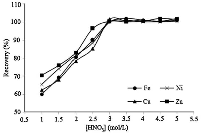 | Fig. 1.Effect of nitric acid concentration on the recoveries of analyte ions. | |