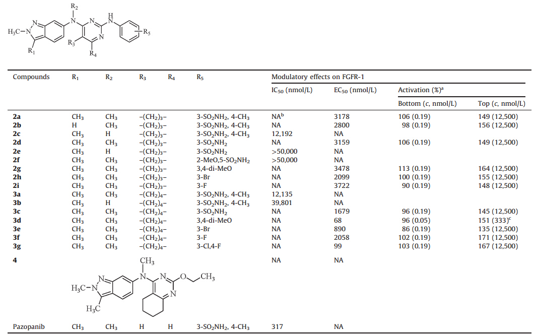 In summary,inspired by the structure of pazopanib (1),two types of novel,cycloalkyl[d]pyrimidine skeletons (2-3) derived from the pyrimidine linker of pazopanib were designed. A total of 16 analogs containing these two skeletons were synthesized,and tested in four pro-angiogenic,kinase inhibitory assays (FGFR-1, VEGFR-2,PDGFR-&bate;,and c-KIT). Unexpectedly,11 analogs were found to show good kinase-selective activation effects on FGFR-1, and two analogs (3d and 3g) showed double-digit,nanomolar selective activation effects on FGFR-1,however,the precise molecular mechanism of the activation effect still needs further investigation. To the best of our knowledge,these activators are the first examples of small-molecular FGFR-1 activators,which might be used as effective chemical probes for the study of FGFR-1 related signaling pathways. Further exploration of the functions of these new activators is under investigation in our laboratories. Acknowledgments