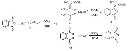 For the purity of KA 5 is of critical importance,initially,its preparation was investigated. The conversion of phthalic anhydride to KA 5 was attempted by a two-step process consisting of the addition of ethyl cyanacetate under diisopropylamine (DIPA) and THF followed by cyclization in SOCl2 and dichloromethane (DCM). In a preliminary experiment,TLC analysis of the reaction mixture indicated that only one product existed in the reaction mixture. After purification,however,ultra performance liquid chromatography (UPLC) and 1H NMR showed that the product was a mixture of 5 and phthalic anhydride (with a ratio of 1:5) which had similar Rf values. Further study elucidated that treatment of phthalic anhydride with DIPA would also lead to the formation of salt 12 which could convert to phthalic anhydride during cyclization. By careful selection of eluting solvents,the pure KA 5 was successfully obtained eluting by DCM/n-hexane (2:1,v:v) (Fig. 3).