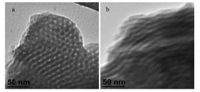 | Fig. 3. TEM images of PS-co-PVBA/SBA-15 viewed along the pore axis (a) and perpendicular to the pore axis (b). | |