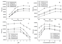 | Fig. 2.Effect of extraction conditions on PVDF membrane extraction efficiency. (A) Effect of the extraction time. (B) Effect of the stirring rate. (C) Effect of the sample solution pH. (D) Effect of the ionic strength. | |