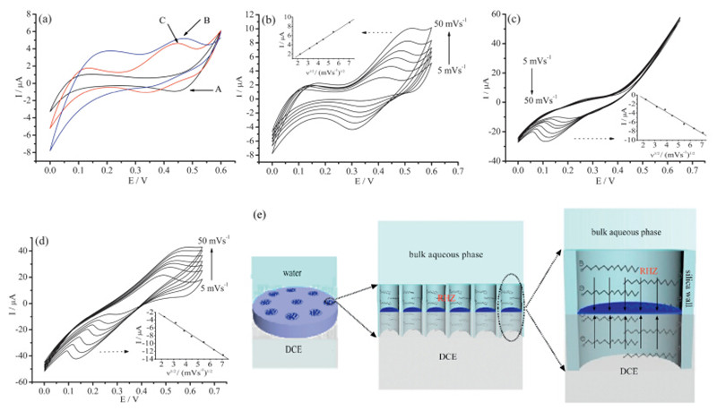 | Fig. 1. (a) CVs for the background of CTAB-HMSM-supported W/DCE interface (curve A) and the IT of TEA+ across the W/DCE interface supported by extracted-HMSM (curve B) and CTAB-HMSM (curve C) at 10 mV s-1 ; (b) CVs for the IT of TEA+ across the CTAB-HMSM-supported W/DCE interface under different scan rates; CVs for the IT of ClO4- across the W/DCE interface supported by extracted-HMSM (c) and CTAB-HMSM (d) under different scan rates. The insets in (b)-(d) are corresponding plots of peak current for IT from W to DCEvs.v1/2 . (e) Scheme of the W/DCE interface with symmetric linear diffusion field formed inside the silica-CTAB nanochannels. | |