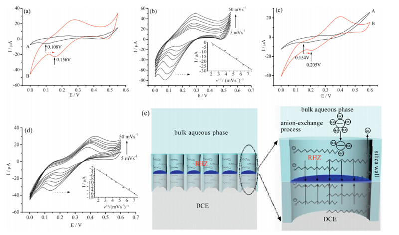 | Fig. 2. CVs for ITs of (a) SCN- and (c) BF4- across the W/DCE interface supported by extracted-HMSM (curve A) and CTAB-HMSM (curve B) at 10 mV s-1 ; CVs for ITs of (b) SCN- and (d) BF4- across CTAB-HMSM-supported W/DCE interface under different scan rates. The insets in (b) and (d) are the corresponding plots ofIpvs.v1/2 . (e) Scheme of the anion-exchange process associated with partial ion-dehydration occurring between the bulk aqueous solution and a relatively hydrophobic zone (RHZ) caused by CTAB. | |