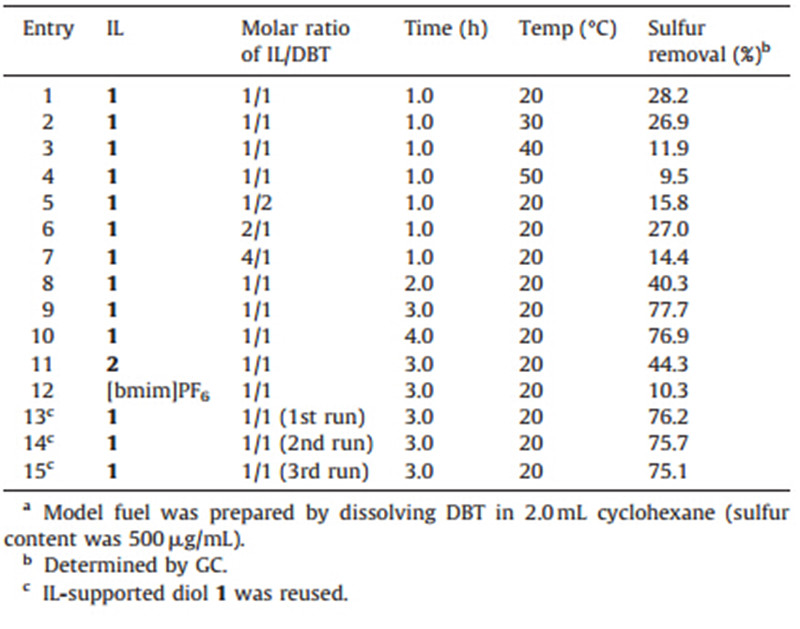 The results of desulfurization with 1 as an adsorbent for DBT containing model fuels are listed in Table 1. It was found that the sulfur removal was dependent upon temperature or sorption time as well as the molar ratio of 1to aromatic heterocyclic sulfur compound,and in this case,1 shows remarkable ability for sulfur removal at 20℃ in 3 h in terms of 1/1 molar ratio of 1to DBT,more than 77% of DBT have been removed from the model fuel (Table 1, entry 9). However,the sulfur removal ranged from 28.2%,26.9%, 11.9%,to 9.5% with the temperature ranging from 20,30,40,to 50℃ (Table 1,entries 1-4),which implies that,with the increase of temperature,the sorption of the sulfur compound in 1decreases drastically. This observation was interpreted that sulfur compounds adsorbed in 1 could be precipitated by a heating process due to heating IL-sulfur compounds to release the sulfur compounds [13]. The molar ratio of 1 to DBT has a strong influence on the sulfur content after sorption by1.At20℃ and 1 h, 1 gave a sulfur removal of 15.8% and 28.2%,respectively,when the ratio of 1to DBT increased from 1/2 to 1/1 (Table 1,entries 5 and 1). Surprisingly,the presence of a 2/1 or 4/1 molar ration of 1to DBT contributed to lower sulfur removals (Table 1,entries 6 and 7). These worse sulfur removals,to the extent that they reflect the behavior of 1,may be related to accumulation of excessive 1,which inevitably impeded thep-interactions between 1 and the aromatic sulfur compound. In addition,desulfurization maximum reached in 3 h at 20℃ with sulfur removals ranging from 28.2%,40.3%,to 77.7% (Table 1,entries 1,8,and 9),indicating that the reaction time is also an efficient factor to desulfurization under the investigating conditions.
