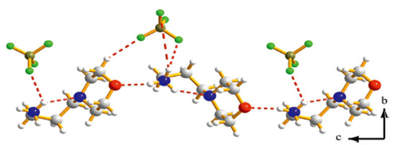 2.2. Synthesis(MPA+) (BF4-) and (MPA+) (ClO4-) (MPA+ is 3-morpholin-4-ylpropyl- ammonium) are offered in high yield by mixing the equimolal acid (HBF4-H2O (40%,w/w) or HClO4-H2O (70%,w/w)) and the flexible 3-morpholin-4-yl-propyl amine in the ethanol solvent. The FT-IR spectra confirm the successful syntheses of compounds 1 and 2 (Fig. S1 in Supporting information). The colorless block single crystals suitable for the X-ray crystal structural analyses were grown at room temperature.