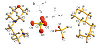 We should note that there are many intermolecular hydrogen bonds in compound 2,including N2-H2C···O1,N2-H2C···O4, N2-H2D···O4,N2-H2···O2,C2-H2B···O5,C3-H3B···O1 (Table S2 in Supporting information),and those hydrogen bonds make the compound form a two-dimensional planar structure (Fig. 8). TheH-bond supramolecular interaction should contribute to the phase transition. Unfortunately,no phase transition and structure change occurred with the temperature change as above mentioned. It is noted that the BF4- anion and the ClO4- anion involved in the formation of hydrogen bond are different: one F atom of the BF4- anion and three F atoms from another BF4- anion alternate to participate in the formation of hydrogen bond in Fig. 6; however,for the compound 2,three O atom of the every ClO4- anion are involved in the formation of hydrogen bond in Fig. 8.