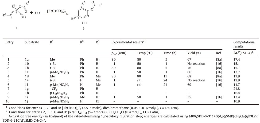 Compared with the experimental discoveries of several modes of [5 + 1] cycloaddition,theoretical studies on the mechanisms of metal-catalyzed [5 + 1] cycloadditions are even rare. Yu group has reported their density functional theory (DFT) calculations on the mechanism of the [5 + 1] cycloaddition of 1-yne-vinylcyclopropanes and two CO units [5c]. To our best knowledge,the mechanism of the [5 + 1] cycloaddition of ACE and CO remains unknown till now. The previous experimental studies by Malacria [8] suggested several pathways for the formation of the resorcinols through [5 + 1] cycloaddition of ACE and CO (Scheme S1 in Supporting information). It is not clear which pathway is actually preferred and which step determines the reaction rate. To answer these questions,we performed theoretical computations on these pathways. In addition,the effect of ester on the reactivity of this [5 + 1] cycloaddition is also experimentally found to be interesting [16]. As shown in Table 1,significant enhancement of reactivitywas observed for benzoate substrate bearing an electron-donating dimethylamino group. For examples,p-dimethylaminobenzoate 1c can react with CO at 50 ℃ to generate the desired product in good yield in 1 h.While pivalate 1b does not work at the same condition but requires higher CO pressure,higher temperature and longer reaction time (entry 3 vs. entries 2 and 2'). Significantly,p-dimethylaminobenzoate with methyl substituent at C3 (substrate 1f) can react with CO at room temperature (entry 6). In contrast, substrate 1e does not work at room temperature (entry 5). Clearly, the electron-rich p-dimethylaminobenzoate dramatically increases the reactivity. In this work,computational investigations on [RhCl(CO)2]2-catalyzed intermolecular [5 + 1] cycloadditions between 3-acyloxy-1,4-enynes (ACEs) and CO have disclosed the preferred mechanism and origins of electronic effects of substrates on reactivities. These results may have broad implications in understanding and design of transition-metal-catalyzed reactions.