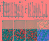| Fig. 3.Cell viability determined by MTT assay under different concentration of WS2-PEG nanosheets (a) and under different concentration of WS2-PEG nanosheets (b) with or without the 808 nm laser irradiation for 10 min (0.4 W/cm2). (c) Optical images of HeLa cells stained by trypan blue (c) and laser confocal fluorescence images stained by Calcein AM/PI (d). (c1) and (d1),control HeLa cells. (c2) and (d2),HeLa cells treated with the 808 nm laser irradiation for 10 min(0.4 W/cm2). (c3) and (d3),HeLa cells incubated with WS2-PEG nanosheets. (c4) and (d4),HeLa cells incubated with WS2-PEG nanosheets under the 808 nmlaser irradiation for 10 min. The power density is 0.4 W/ cm2. The incubation concentration of WS2 nanosheets is 75 μg/mL. | |