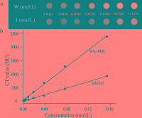 3.4. X-Ray attenuation propertyThe high atomic number and X-ray absorption coefficient of tungsten makes it possible that WS2-PEG nanosheets can be used as a CT contrast agent,the X-ray attenuation coefficient of the W atom at 100 keV is 4.438 cm2/kg,which is higher than that of iodine (1.94 cm2/kg at 100 keV). Iohexol,a commercial iodine-based CT contrast agent,was used in the clinic. The CT values of different concentrations of WS2-PEG nanosheets or Iohexol in water were measured in Hounsfield units (HU), respectively. The Hounsfield value was increased linearly as a function of the concentration of W and I,respectively. However, the increasing trend of the WS2-PEG nanosheets (the slope of the CT value for WS2-PEG nanosheets was ~15.65) was much higher than that of Iohexol with a slope of CT value of ~6.07 (Fig. 4b). At equal concentrations of W or I element,the CT contrast enhancement of WS2-PEG nanosheets was much higher than that of Iohexol,which is primarily due to the higher X-ray attenuation coefficient of W than that of I. The CT images were presented in Fig. 4a.