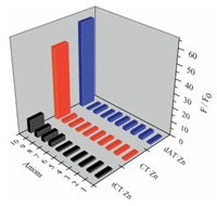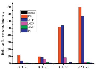 | Fig. 3.Relative fluorescence intensity of dCT·Zn, tCT·Zn, CT·Zn and dAT·Zn to various biological phosphates including PPi, ATP, ADP, AMP and Pi in HEPES buffer (10 mmol/L, pH 7.4). The results of dCT·Zn were based on Ref. [18]. | |