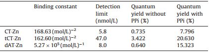 | Table 1 Binding constant, detection limit and fluorescence quantum yield of CT·Zn, tCT·Zn and dAT·Zn. |