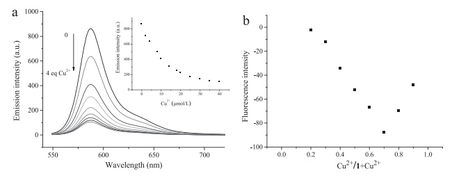 | Fig. 2.(a) Emission spectra of 1 (10 μmol/L) in the presence of various concentrations of Cu2+ (0–40 μmol/L). (b) Job’s plot of 1 and Cu2+. The total concentration of 1 and Cu2+ was kept constant at 10 μmol/L. Condition: λex = 540 nm, λem = 587 nm, 1 mmol/L Tris–HCl buffer, pH 7.4, 25℃. | |