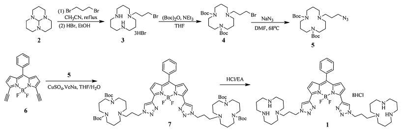 With the above consideration and to further expand the application of macrocyclic polyamines,we have designed and synthesized a [12]aneN3 modified boron dipyrromethene (BODIPY) compound 1,which can be successfully applied as highly selective and sensitive sensor for the sequential recognition of Cu2+ ions and ADP in aqueous solution and in living cells. 2. Experimental
