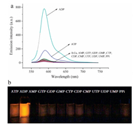 | Fig. 3.(a) Emission spectra of 1–Cu2+ (10 μmol/L) toward each of various anions (15 equiv. of ATP, ADP, AMP, GTP, GDP, GMP, CTP, CDP, CMP, UTP, UDP, UMP, PPi) in Tris–HCl buffer (1 mmol/L, pH 7.4, 25℃). λex = 540 nm. (b) The color changes of 1–Cu2+-ADP and other biological molecules under the irradiation at 365 nm. | |