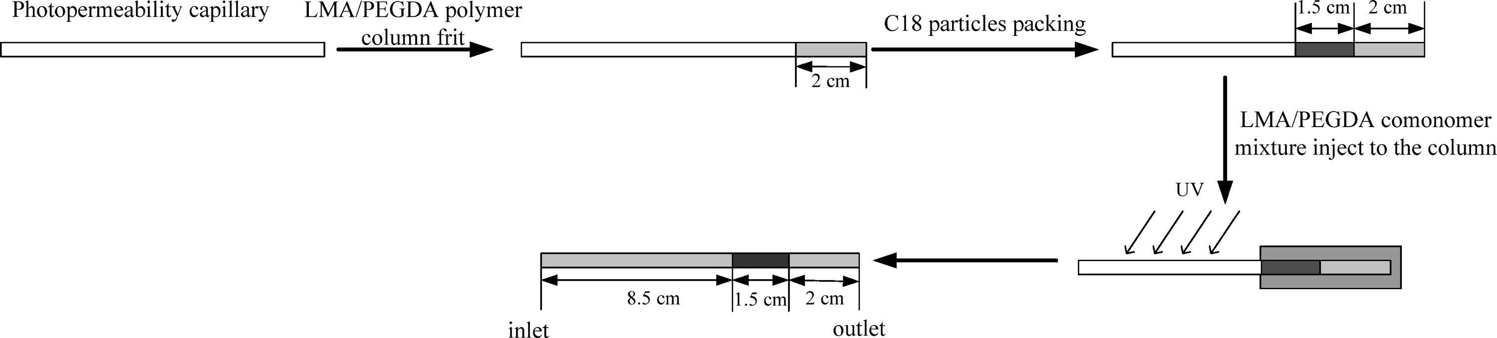 2.2. The preparation of particulate capillary precolumn with doubleend polymer monolithic fritsAs shown in Fig. 1, UV transparent coating capillaries (100 μm i.d.) were pretreated with γ-MAPS [23], and then filled with 2 cmof the polymerization solution containing 240 μL LMA, 160 μL EGDMA, 400 μL 1-propanol, 200 μL 1, 4-butanediol and 2 mg DMPA, finally sealed at both ends with rubber stoppers and exposed in the ultraviolet light (λ = 360 nm) for 5 min. Subsequently, the C12 monolith frit was washed with methanol to remove unreacted monomers, and C18 silica particles were packed into the capillary till the column length reached 1.5 cm. After being flushed with methanol at 20 MPa for 30 min, the inlet of the capillary was further filled with polymerization solution, followed by exposure in UV for 5 min with covering packed C18 silica particles. Finally, the prepared precolumn was washed with 1-propanol to remove unreacted monomers, and cut into 12 cm long (include 10.5 cm long monolithic frits).